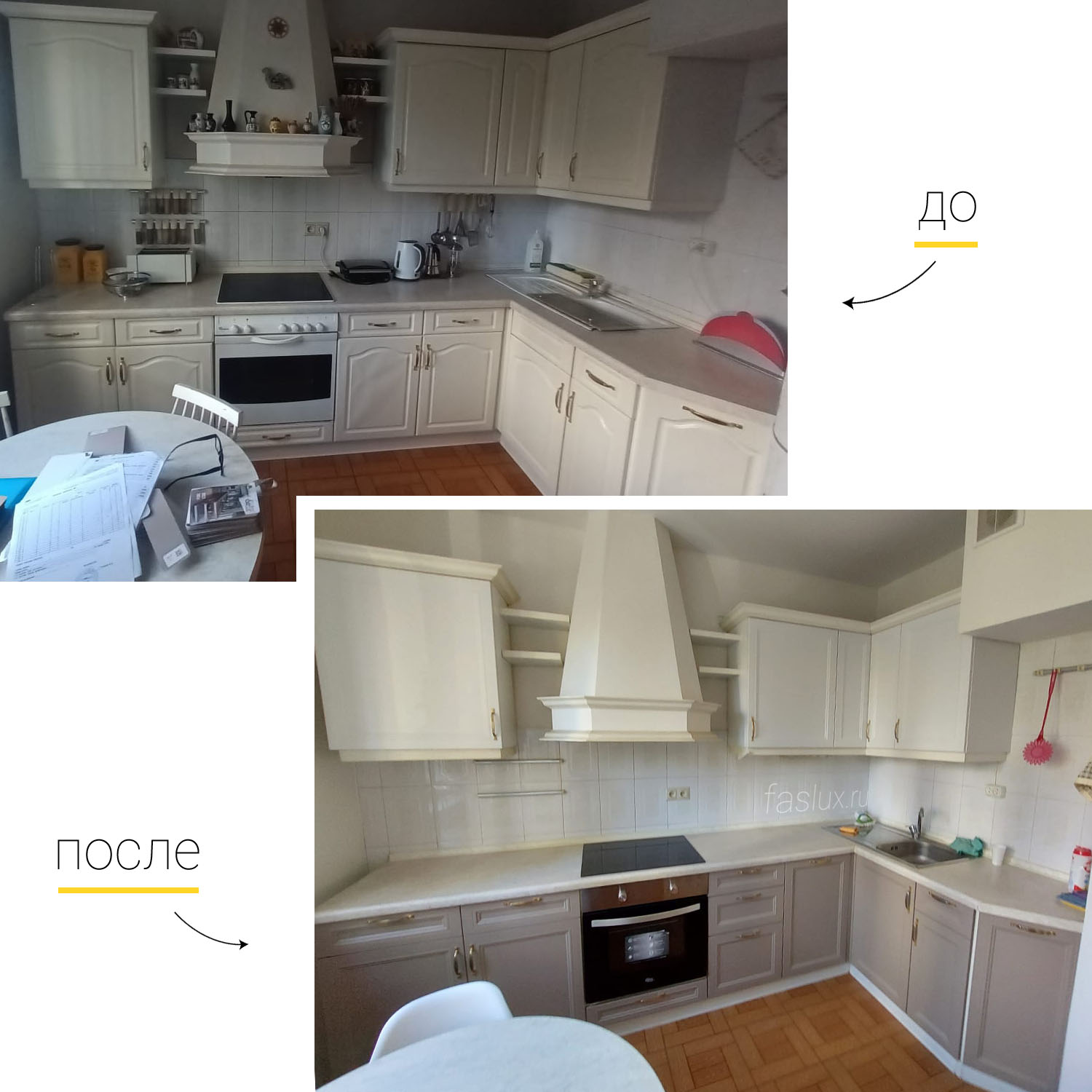 Заменили верхние и нижние фасады МДФ в пленке ПВХ в цветах MAT-01 Катарина (верхние) и MAT-07 Мурило (нижние)
