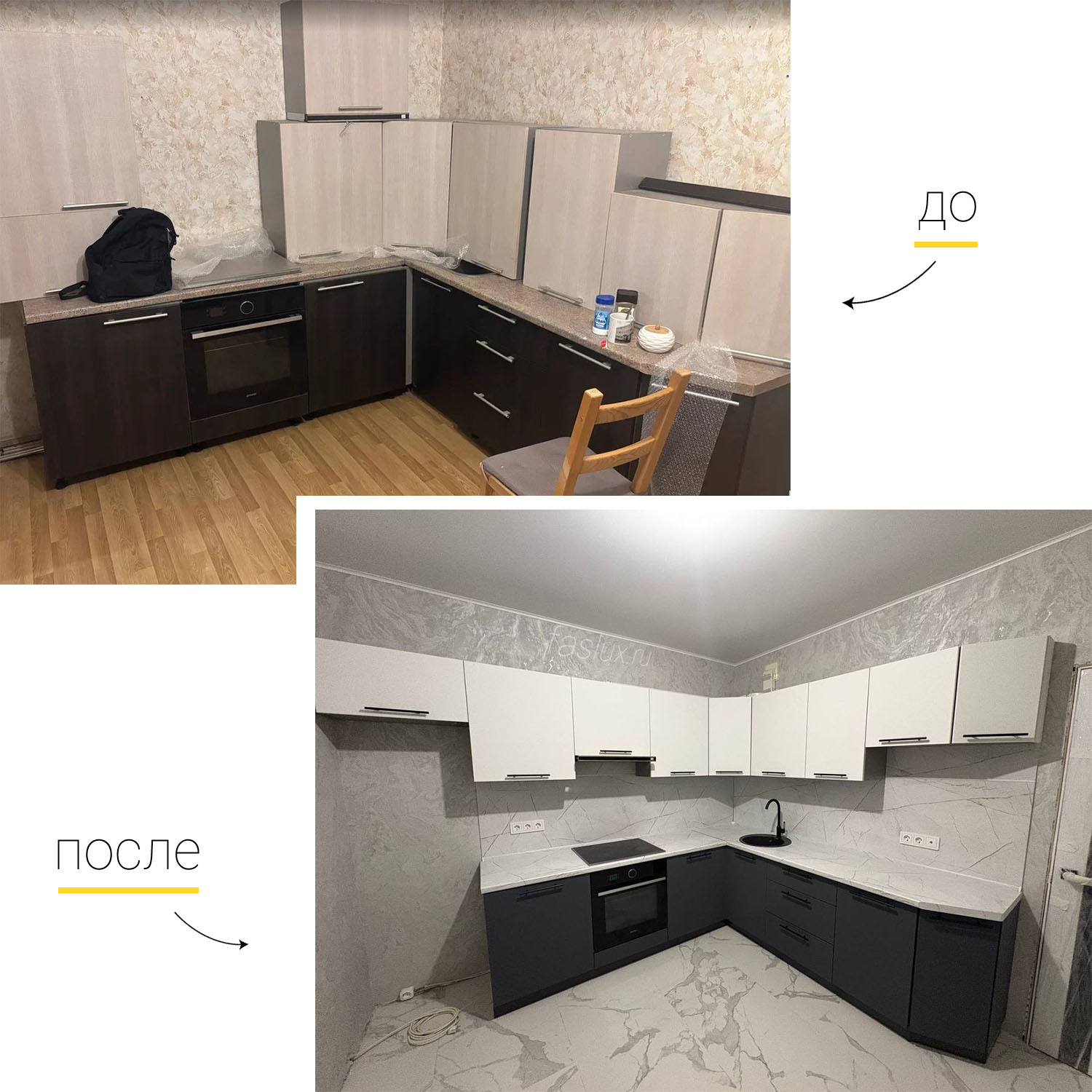 Заменили и установили фасады МДФ в пленке CRM 101-SD-L Сканд айс (верхние) и CRM 108-SD-L Санд антрацит (нижние)
