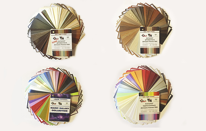Каталог декоров пленки ПВХ от ВДМ групп. Приятная на ощупь пленка. Более 90 цветов.
